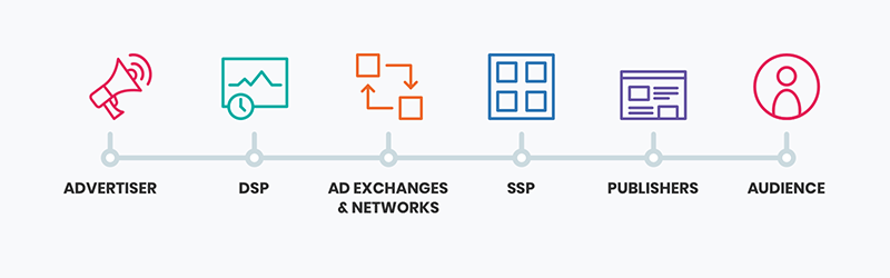 Comme vu plus haut, le programmatique c’est un système d’enchères en temps réel (RTB) rendues possibles grâce au développement des algorithmes. Concrètement, au moment où l’internaute change de page pour arriver sur une nouvelle page qui comporte au moins un espace publicitaire disponible, la vue de la publicité dans l’encart par l’internaute, l’audience donc, va être mise aux enchères. Ce sont les SSP (Selling Side Platform) qui gèrent les inventaires disponibles et les proposent aux enchères en précisant les données dont ils disposent (informations sociologiques, comportementales, etc.). En face, les DSP (Demand Side Platform) enchérissent. Ce sont les agences et les régies qui cherchent à toucher leur audience cible, de façon cross device, à partir d’une seule plateforme. La mise à disposition de l’audience et les enchères se font via un adexchange, pour un achat d’audience spécifique, ou via un ad network, où les audiences sont agrégées et packagées. Les enchères se font en un millièmes de seconde de sorte qu’au moment où l’internaute arrive sur la page, la publicité a déjà chargé.